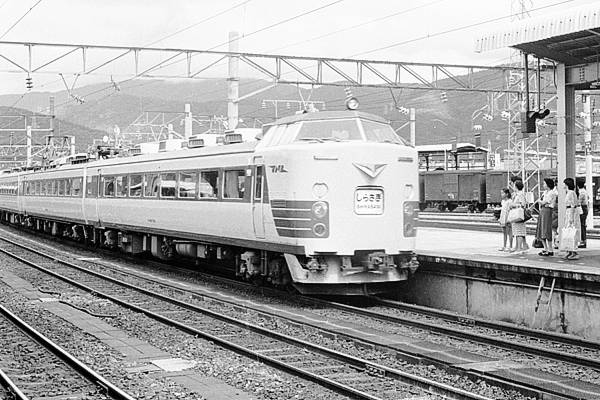 今回のヘッドマーク探検団も前回に引き続き、北陸新幹線の敦賀アリバイ作り延伸を 愚痴る為、中京圏対北陸圏リンクの特急「しらさぎ」国鉄時代は、新製間もない485系 300番台をアップでございます。6番線に到着する下りの「しらさぎ」の背景に見えてる 有蓋貨車の更にその奥、敦賀第一・第二機関区が在った処にアリバイ延伸開業した、 北陸新幹線のホームを地上30数メートル高みに造ったそうです。その新幹線ホーム 直下の地平に在来線特急用のホームを新設して、新幹線への乗り換え所要時間は、 8分とJR西は豪語してるようですが、ネット情報だと安全圏は、10分以上みたいです。 ってぇことは、旧来のホームに発着する列車からの乗換所要時間は、どの位なのか 考えただけで疲れちゃう。それに、ググったって出てくんのは、乗車券の他に余分な 料金のかかる在来線特急と新幹線の接続所要時間だけでございます。所要時間も 大して変わんないのに乗換の手間と運賃が余分にかかる、北陸新幹線敦賀延伸で 敦賀終着に変わっちゃう、今の681系特急「しらさぎ」って「乗れ乗れしらさぎ」に愛称 変えちゃえば、JR西日本殿。 国鉄 北陸本線 敦賀1976-8