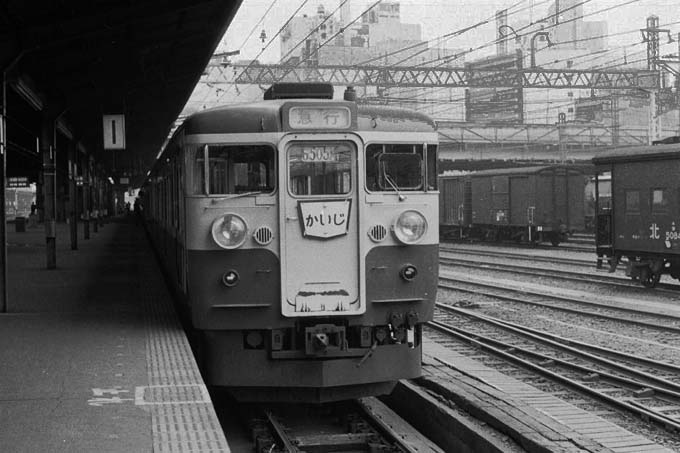 115系使用の不定期急行「かいじ」3号6505M(かわぐち3号2535M併結)、当然グリーンを 除いて普通は全部自由席。もし発車間際に駆け込み乗車で、満席状態で甲府まで、立って行く 羽目になったら惨めもイイとこ、特快乗って、高尾から始発の各駅乗り継いだ方が、安いし、楽チン でも、現在の甲府まで100kmチョットの距離に高い特急料金払わされる、183系の一様特急の ”かいじ”よりは良心的かも知れませんね。この写真は「かいじ」のHMより新宿駅1番線ホームや バックに見える”ヨ”や”ワム”に懐かしさを感じるの私だけ?十分に見慣れた筈の日常なんですが、 今はこれが見られないんです。 中央本線 新宿 1971-11 |
