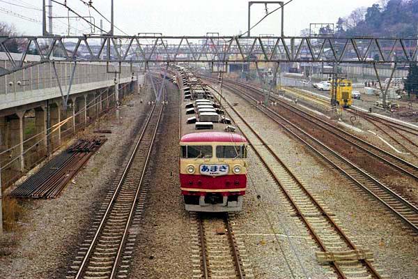 ♪あなたと〜 越えたい〜 あまぎ〜 越え〜♪ おじさん熱唱、OLさん達大迷惑、ご存知 石川さゆりの「天城越え」。あたしゃ、カラオケでこの曲歌うたびに、両の瞼の裏に、くっきり あの157系の勇姿、浮かんできますねー。 元々は、以前このHM探検団にも登場した デラックス急行「伊豆」。それが1969年特急格上げとなり、「あまぎ」に変身。当時正義感に 燃える青年は、設備が同じで特急になったら実質値上げじゃないか、”国鉄総裁は出て来い” と憤ったりもしたもんです。でもよく懐具わい考えたら、どうせ自分達が乗れる列車でもないし、 東海道東京口に久々復活の電車特急だから、まーいいか、と即軟化。”大きい事は良い事だ” なんて言葉が流行ってたけど、HMがでっかくなっちゃったよ、昔の方が小粋でいいやねぇ〜。 157系「あまぎ」は約7年間走り、1976年に183系に道を譲って引退。そして1980年に185 系が登場すると、名前も「踊り子」に。この185系、フェースはなんとなく157系の流れを受け 継いでいるけど・・・ ちょっと、まー言いたいこともあるけど、それはまた改めてと言うことで、 最後に皆さんもご一緒に! ♪あまぎぃ〜〜 ごぉーおぉ〜〜 へぇ〜〜〜♪ 東海道本線 大船付近 1976-3 |