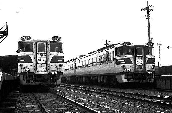 強引な前振りで始った今週のHMはキハ82系特急「あさしお」同士の交換シーンです。 1964年金沢ー出雲市と一風変わった経路のDC急行として誕生した先代「あさしお」は、 ヨンサントオの改正で、急行「大社」に吸収され「あさしお」の愛称は一時消滅、ところが 1972年3月に京都と北近畿地方を結ぶDC特急として復活。この写真の頃はキシ80を 編成に加えた特急の名に恥じない列車でした。その後使用車両はキハ181系に変り、 お決まりの短編成化を経て、ついに1996年3月に引退、大阪太郎も涙したって?。