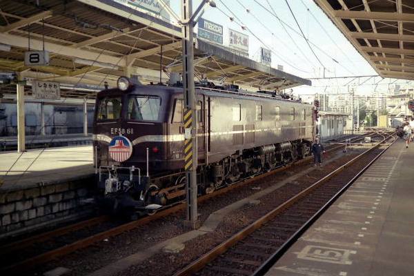 お召しの他にも数々のネームドトレインを牽引してますね。ところが自慢じゃないけど 蒸気でならしたオジサン鉄は、ロイヤルエンジン?原型広窓?ダカラドウシタ、って 見向きもしなかった。 ここにご紹介するは「バーボンエクスプレス」。入れ換え中で客車が写っていないけど、 星条旗塗装の50系がお供、乗ったお客は車内でバーボン飲みながらのスカ線経由で 大船までほろ酔い気分の旅を味わいました。撮った写真は仕事の帰りのついで写真。 それも自分の意志で撮ったのでなく、同僚が”コレは珍しい”といったのでショウガナク シャッターを押しただけなんです。