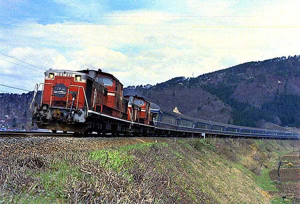 これじゃ日本海もさぞ水が冷たいでしょうね。夏だ!! 海だ!! 日本海!!とはいきませんが、 せめて海のムードを味わってもらおうっとの登場は特急「日本海」 えぇっ〜、これは 夏の海とは全くイメージが違う?? そうなんです。やはりこの列車に似合うのは、演歌の 世界ですよね。♪悲しみ〜本線日本海〜♪ とか・・・ 「日本海」 はその名の通り日本海縦貫列車として、1950年11月に、大阪ー青森間の 急行に名づけられたのが最初。その後この急行「日本海」は、ヨンサントオの改正で 20系ブルトレ特急に変身。名門寝台列車として今も一日2往復が大阪ー青森・函館に 運転されている。勿論今は全線EL牽引だが、奥羽本線が非電化の頃はDD51重連で 運転されていました。SLファンには邪魔者扱いされたDD51も、こうして特急の先頭に 立つ姿を見ると、中々の雄姿だと思いませんか。