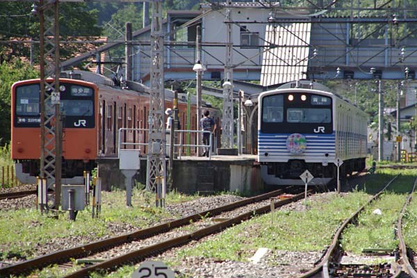 思わせる多摩川上流の渓谷に沿って走る長閑な観光路線へと早変り。その青梅線に 2001年に登場したのが、201系の川側窓と座席を改造して展望観光列車に変身させた 「四季彩」。働くオト〜サンを毎日ベルトコンベアーの様に職場に運んだ通勤用車輌の 201系が今度は、激務に荒んだオト〜サンの心を和ませる癒し系の車輌になるとは、 なかなかグッドなアイデアですね。土日だけの運用だけれど乗車券だけで乗れるのも 嬉しいっすよね。ところが今や201系は風前の灯、チョット前なら当たり前の交換風景も 銀箱E233系のお陰で記憶上の風景なっちまったようです。この先「四季彩」用201系の 運命は如何に?国鉄最後の通勤型車輌の運命や如何に! 青梅線 日向和田 2007-8 |