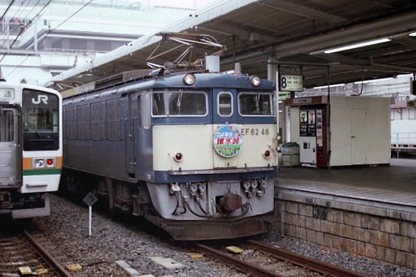物語となってしまいました。そのEF63と共に消え去ったのが、碓氷峠区間直通列車の 牽引用に開発されたEF62。碓氷の急勾配でEF63との協調運転を前提にした設計が 取り入れられていました。でもこれが災いしたのか、JR-Eのインボーか?、新幹線の 開通による信越本線横川〜軽井沢間碓氷峠閉鎖で、山の仲間だったEF63と一緒に