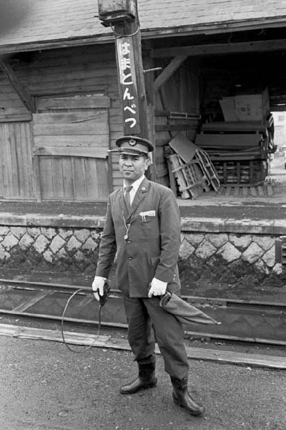 タブレットを持つ白い手袋が印象的、後ろの駅名板は勿論ホーロー製。