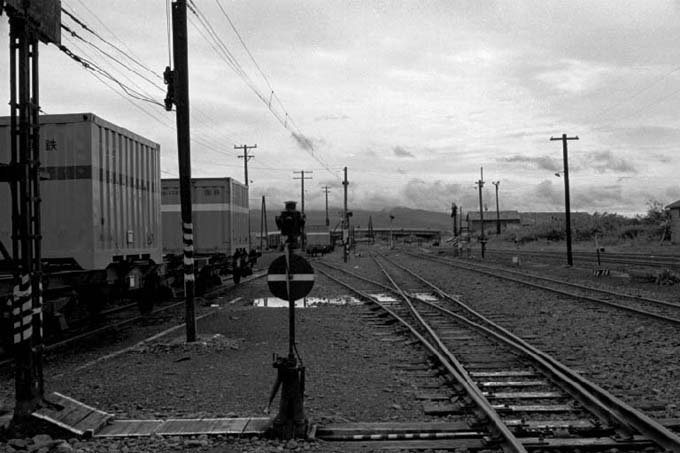 浜頓別1番線より見た北見枝幸方面、電線の様に高く張られた腕木信号の作動用ワイヤーが冬の厳しさを物語る。