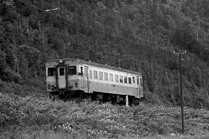 亜寒帯の針葉樹林と雑草に囲まれて14kmポストを通過するキハ22、真夏だと言うのに窓は閉まったままだ。