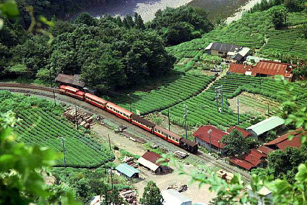 今では総てがダムの底、茶畑に囲まれた川根唐沢駅に停車中のDD100型牽引の混合列車。