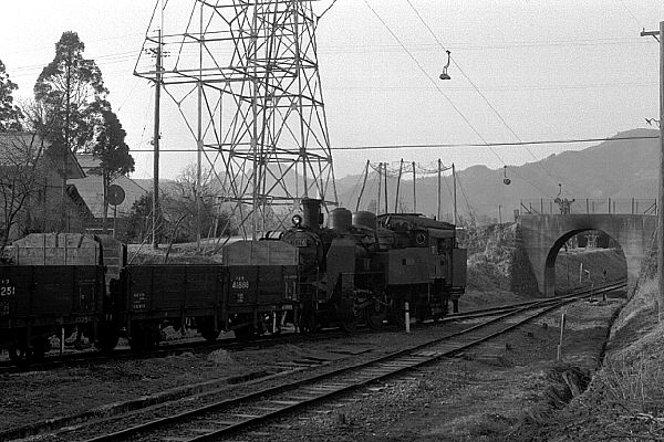 鉱山がある会津加納でC11 178号機がトラを従えての入換え風景、バックの索道は鉱石運搬用。