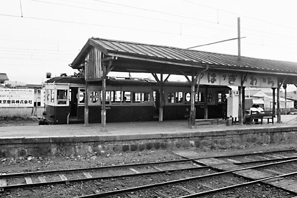 丸窓電車の上田駅、石積みの低いホームに撓んだ木造上屋が堪りません。
