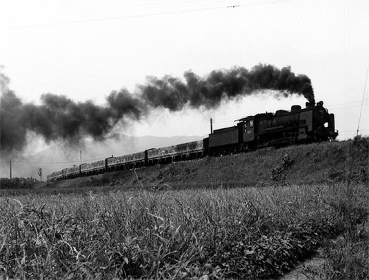 1968.8 寄居ー折原 築堤を行くD51:牽引の貨物列車