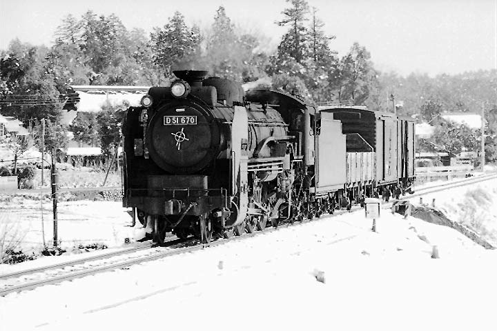 まだ雪の残る日、入間川橋梁を渡り、金子坂にかかるD51の貨物列車 1970,3 金子ー東飯能