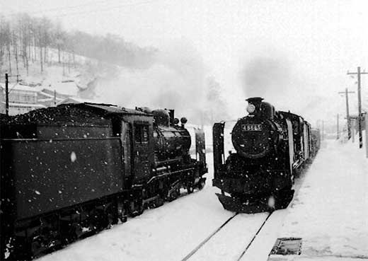 1971.3 荒屋新町にて ハチロクの交換 一見追い抜きのようだが 下り列車は後補機