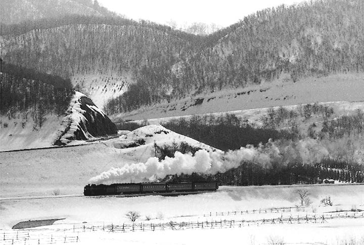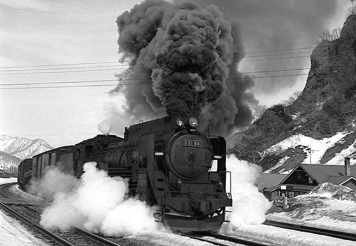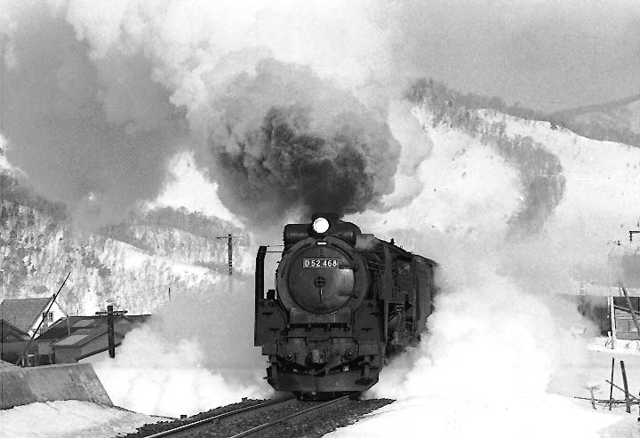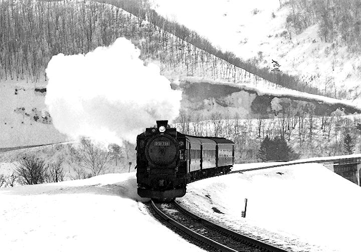 | 室蘭本線で長万部の次の駅「礼文」。大岸側は海沿いの景勝地礼文華海岸を行く姿、そして静狩側は 礼文華トンネルに向かって峠越えに挑む、雄大な大築堤を行く姿が見られました。走る機関車はD51が 中心でしたが、私が行った頃はまだD52の姿も見ら れ、煙を高く上げて長大貨物を牽引する姿も 見られました。1970年に静狩側を訪れた後、翌1971年三月には大岸側の海沿いのポイントを撮った のです が、冬場には珍しく天候にも恵まれD52・D51の姿を撮ることができました。この時期はC62重連 「ニセコ」を撮るのが主目的であり、礼文はそれぞれ一 度だけの訪問に終わりましたが、まずまずの 成果を得られたと思います。惜しむらくは特にカラーのネガがカビにやられてしまったこと。できるだけ カビの修正はしてみましたが、30年以上も前のものだけにあるていどやむを得ないのかもしれませんね。 |