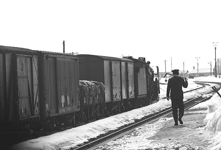 1970,3 礼文駅にて 朝の駅に貨物列車が佇む、職員さんはポイント点検に向かうのだろうか?