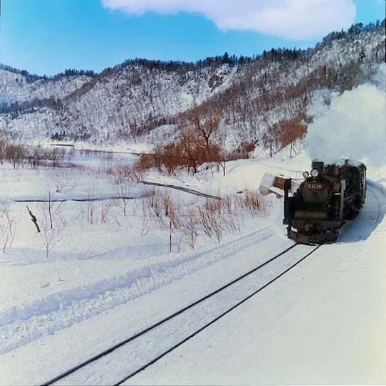 | ..雪の宗谷本線を行くパシフィックC55。1750mmのスポーク動輪がとても印象的でした。ここも幾度となく訪れました。 夜旭川で急行「利尻」に乗車。(もちろん普通座席)南稚内で下車して、抜海ー南稚内で撮影。その後音威子府などで 撮影したあと夜旭川に戻り、ふたたび「利尻」に乗車。これを3、4日続け、今日も宿は「利尻荘」という日々でした。 若いから出来たことでしょうが、今思えばよくやったものです。そうして撮った写真、良かったら見ていってください。 |