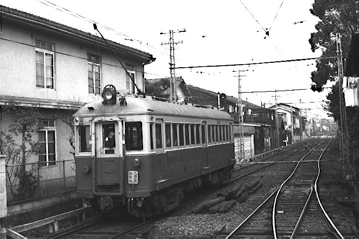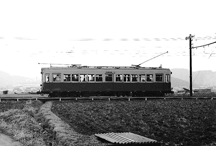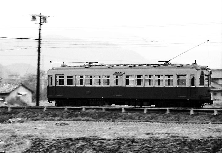 して、 京都の北東部を走るこの路線は、殊のほか寒かった記憶があります。九州からの帰路、夜行急行では一日で 帰り着かないため、大阪まで急行で来てここで 一日過ごし、大垣発の夜行344Mを乗り継ぐ行呈でした。 大阪からは淀屋橋を経由して京阪電鉄の特急。三条から市電に出町柳へと向かったのですが、問題は 京福線内でどう動いたか・・・まるで記憶がありません。出町柳で写真を撮ってその後鞍馬へ向かったはずなのに、 どこか途中で降りてしまったようです。なに せ鞍馬の駅の写真はないし、あるはす゛の切符も出てこない。 下車して走行シーンをどこで撮ったのか??? 構内配線などから見ると二軒茶屋かと思うのですが・・・なんとも 情けなくUPもどうしようか考えたのですが、皆様に撮影地を教えてもらえればと思い、UP してしまいました。 叡山線は1978年までポール集電をしていたが、これは国内で最後まで残ったポール電車でした。 |