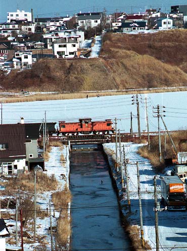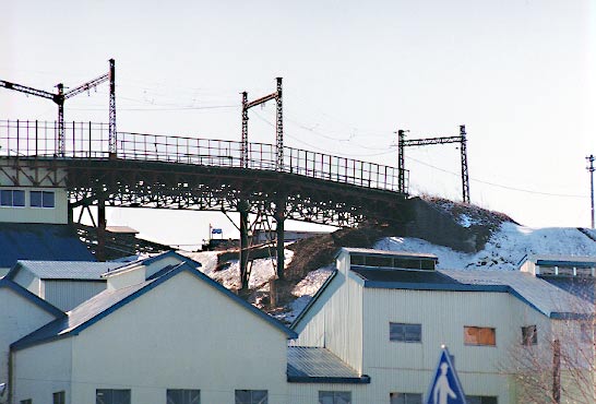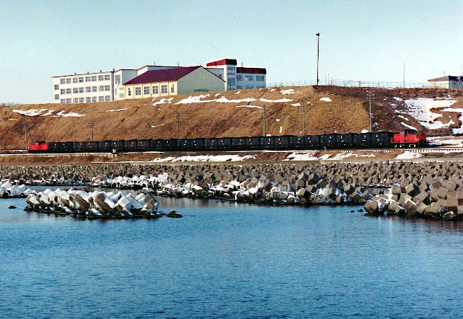 臨港鉄道を前身に持つ会社です。 1979年に臨港鉄道を吸収合併するカタチで発足し、臨港鉄道より引き継いだ東釧路ー春採ー知人ー臨港、東釧路ー城山とい う 路線で営業を開始しました。臨港鉄道時代は旅客営業も行っていましたが、1986年に国鉄東釧路の貨物取扱い中止により路線の 縮小を図り、その後は春 採ー知人の間4,0キロの営業となりました。太平洋炭鉱は海底の炭鉱で、地下深くから掘り出された石炭は ベルトコンベアで春採の選炭工場に運ばれる。以前はこの間は610mmゲージの凸型電気機関 車で運ばれていましたが、これまた 我々にはワンダーランドとも言うべき鉄道で、こちらは別のページで紹介させていただきます。さて春採の選炭場に運ばれた石炭は ここから鉄道の手によって知人の埠頭まで運ばれ、ここで船に積み替えられ、京浜地区に運ばれていました。列車ダイヤは平日10 往復程度の列車が設定されていましたが、出炭量で左右され、選炭工場に石炭が溜まったら運行されていたようです。通常12ユニット (二両連接の貨車を使用していたため24輌)、前後にDLをつけたプッシュプルで運転されていました。 |