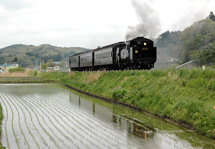 した。私は今回も試運転への訪問でしたが、 田んぼに丁度水の入る季節。日本的な風情とC11のドラフト音を楽しんできました。しかしこの時期になると 気温 が高くなり、煙の方はイマイチの状態でしたが、午後からは降りだした雨のおかげもあって、綺麗な 白煙が見られました。しかし今回が三回目の磐東ですが、い ずれも雨模様と言うのは、残念なのか天の 助けなのか・・・ また今回はネットでお付き合いいただいている方々に、今まで知らなかったポイントにも 案内して いただきました。おかげさまで、過去2回とはまた違った写真を撮ることができ、この場をかりて お礼申し上げます。写真はすべて5月18日撮影、また天候のおかげで、全般に暗めのシーン多めですが、 ご覧いただければ幸いです。 |
