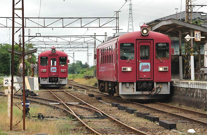 | くりはら田園鉄道は1918年に設立された、ナローの栗原軌道がそのはじまりでした。1921年に石越〜沢辺間が 開通し、さらに翌1922年には栗駒(当時は岩ヶ崎)まで開業、当初の予定はここまでの路線でした。その後 1940年に岩ヶ崎〜細倉鉱山間の免許を取得し、さらに1942年にナローのまま地方鉄道に変わり、社名も 栗原鉄道となり、同年末には岩ヶ崎〜細倉鉱山間が開通し、現在の路線が形成されました。その後1950年に 全線電化、さらに1955年には軌間を1067mmに改軌し、国鉄との貨物輸送を直通運転化も行なわれた。また この年には栗駒電気鉄 道と社名を変更した。1964年にはバス会社の陸前バス(自社系列)と合併し、社名を 宮城中央交通と改めた。再びバス部門を切り離し、鉄道専業の栗原電鉄と改称したのは1969年のこと。この時、 筆頭株主は細倉鉱山を管轄する三菱マテリアルになっている。このころから厳しい状態が続いている同線だが、 特に大きかったのは1987年に細倉鉱山が閉山、貨物輸送の廃止であった。当然のように、三菱マテリアルの 補助も減少し、1988年には細倉〜細倉鉱山間も廃止された。細倉鉱山廃止から2年後の1990年に、細倉鉱山 跡地に「細倉マインパーク」が誕生し、この時に細倉〜細倉マインパーク前間0.2kmを延長し、その際に 旧細倉駅は廃止された。ただし書類上は、駅の移転・改称となっているそうです。1993年には、親会社の 三菱マテリアルから栗原電鉄の廃止の意向が地元市町村に打診され、協議の結果沿線の5町(石越・若柳・ 金成・栗駒・鶯沢)と、宮城中央交通・宮交栗駒バスとの経営により第三セクター化された。 第三セクターとして再スタートを切った栗原電鉄であるが、なおその経営は苦しく、電気鉄道を断念、内燃化 されることとなり、1995年、ポールなどはそのままに内燃化され、同時に社名を現在のくりはら田園鉄道に 改められた。しかし、依然として経営は厳しく、廃止問題は予断を許さない状況となっている。 |