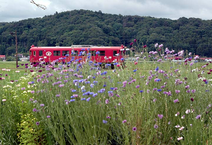 沢辺ー津久毛 花畑を行くくりでんの気動車。