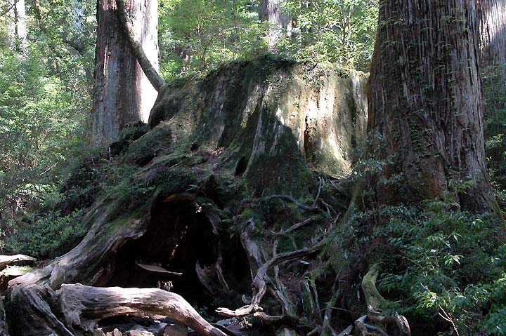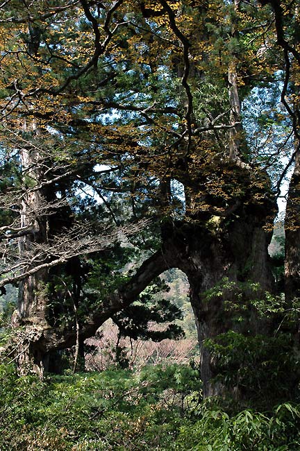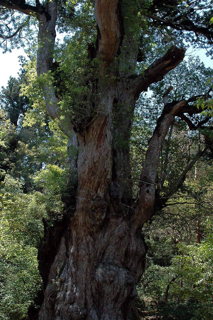 | 更に歩を進めること2時間あまり、大株歩道入り口でようやく軌道敷と別れを告げて本格的山道に 入り ます。そしてここからいよいよ世界遺産地帯へ、名のある屋久杉の巨木達もこのあたりから 見られるようになるのです。山道に入り30分あまりまず最初に見えるのが翁杉で、樹齢2000年と いわれていま す。杉本体にさまざまな植物が着生している様子は、それだけで一つの世界がある ようにさえ見えます。更に程なく見えてくるのがウィルソン株と呼ばれる切り 株!! 樹齢3000年、 根廻り32m、胸高直径4.39m古株の中は空洞になっていて、小川が流れて広さは10畳ほどの 大きさです。1586年(天正5年)牧村 の五郎七が足場を組、豊臣秀吉の命令により京都の方向寺 建立の為に切ったとされています。米国のウイルソン博士によって世界に知らされたのでこの名が ついています。これもまた見ごたえがある小宇宙といった感じでした。ここでしばしの休息の後、 更に急になった山道を行くと、次に見えてくるのが夫婦杉と呼ばれているもので、樹齢2000年、 どちらか一方から出た脇枝が相手の幹に喰い込まれて、手をつないだ姿をしているのでこの名前が ついています。 |