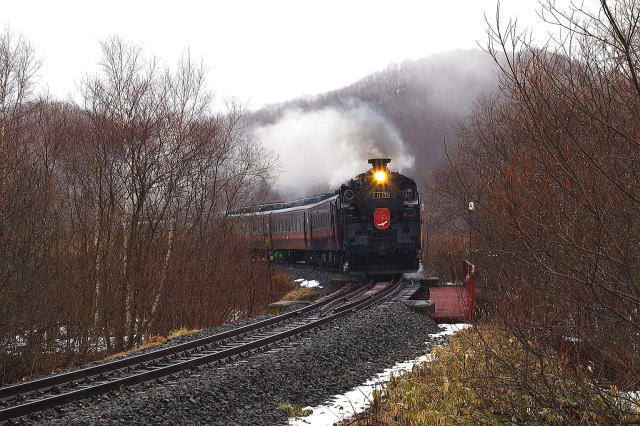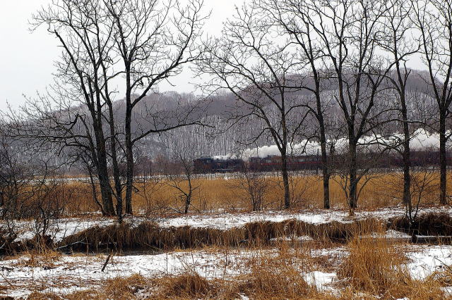 返しの撮影地は裏二本松下の直線区間で待つこと1時間、通過直前に・・・ 06.3.20 茅沼→塘路