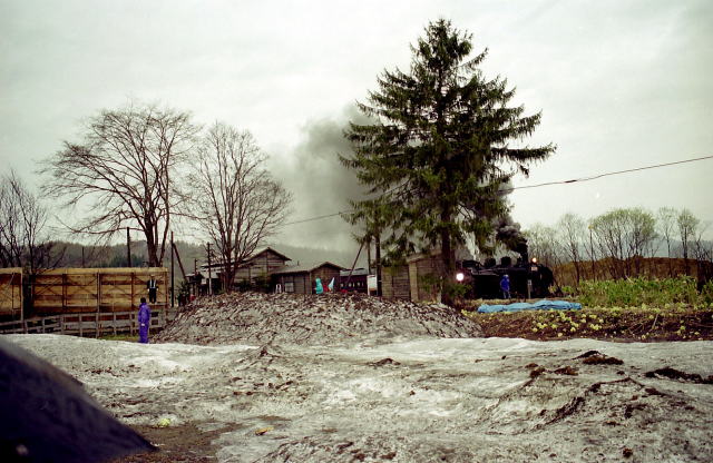 | NHK朝の連続ドラマ「すずらん」は、当初真岡鐵道のC1266で始めましたが、2回目からは JR北海道復活直後のC11171になりました。但し客車はJR東日本からの借用でした。 撮影ダイヤも判らず現地入りしたため、ろくな写真は撮れずじまいでしたが、国鉄(鐵道省?) 時代を再現した貴重なシーンに巡り会えました。 1999年5月12日撮影 |